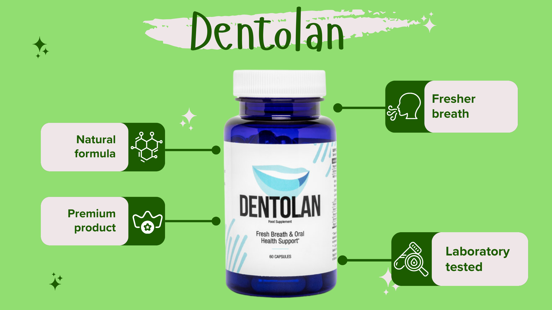 Dentolan is a new, all-natural dietary supplement that helps with bad breath, no matter what the cause is. The supplement’s rich formula goes to the root of the problem, leaving you feeling fresh for a long time after you stop using it.